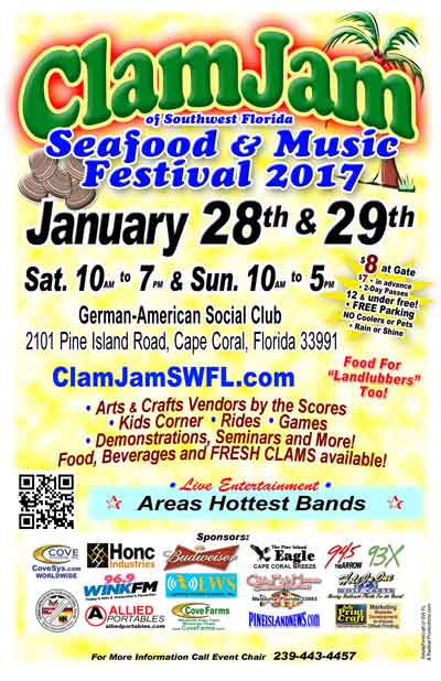 Cape Coral, Fla. – Radikal Productions will host the Annual ClamJam of Southwest Florida Seafood & Music Festival on Saturday, Jan. 28th from 10 a.m. until 7 p.m. and Sunday, Jan. 29th from 10 a.m. until 5 p.m. The event will take place at The German American Social Club (2101 Pine Island Road, Cape Coral, Florida 33991) Tickets are eight dollars at the gate and seven if purchased in advance, www.ClamJamSWFL.com click on tickets, children 12-and-under are free, free onsite parking. No Coolers, No Pets. Rain or Shine Event. Event planners expect over 7,000 to attend.