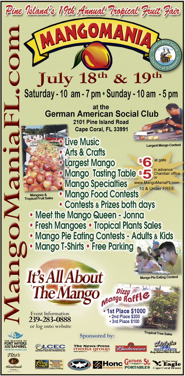 “Last year’s MangoMania was the best in a decade. Clear skies and an over whelming supply of Pine Island Mangoes”, said Steve Timcak past president of the Greater Pine Island Chamber of Commerce and owner of Island Visions Gallery. “I worked the Tasting Table during the two day event, we never stopped cutting mangoes and the people lined up for hours both days. We offered our visitors four to five different verities of mangoes, we will be offering the same this year. We Got Mangoes” said Timcak.![]()