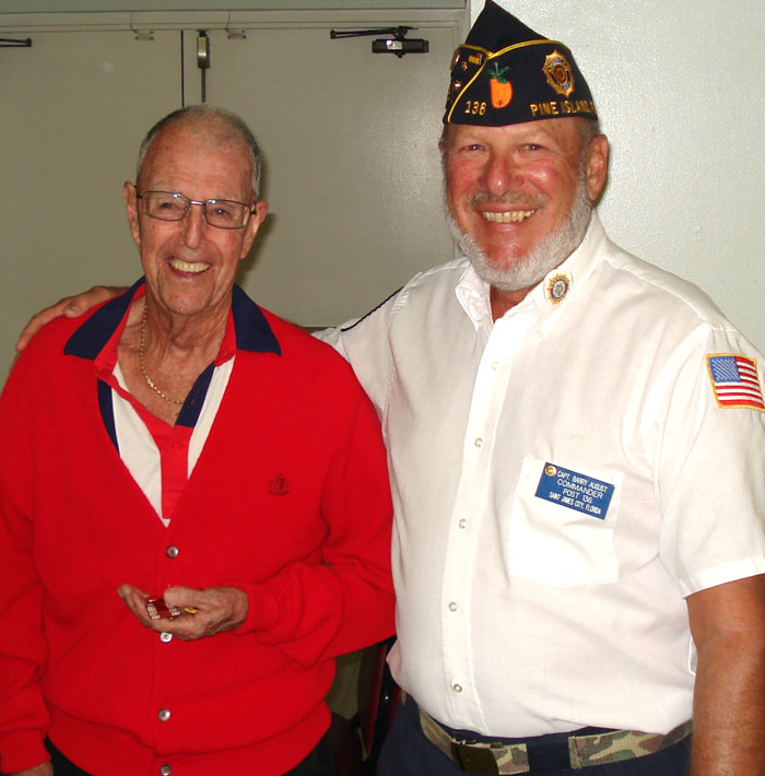 On Wednesday, November 17th at the American Legion regular Membership Meeting, Commander Barry August presented WWII Veteran, 93 year old Walter Dutton a long-time Bokeelia resident, with the medals Walter earned oh so many years ago.