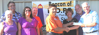 The Kiwanis Club of Pine Island, in conjunction with the Matlacha Hookers recently sponsored a "Casino Night" fund-raiser at the Tarpon Lodge. The event netted $7,800. The proceeds will be used for the Beacon's "Students Achieving Success (SAS)" program which in turn supports an after school mentoring program for Pine Island's 4th and 5th graders, the Pine Island Teens Program, English as a Second Language program, a GED program, and the Beacon's Wellness program. In the picture, a check is being presented by Andre' Mule', President of the Kiwanis Club of Pine Island to Dr. Jim Cole who started the SAS program also present at the presentation was Elsie Stearns, President of the Beacon of Hope, Kiwanian's - Bill Thacher, Nick Mohr, John Cammick, Scarlett Player and Matlaha Hooker's Madam - Arlene Stornello.
