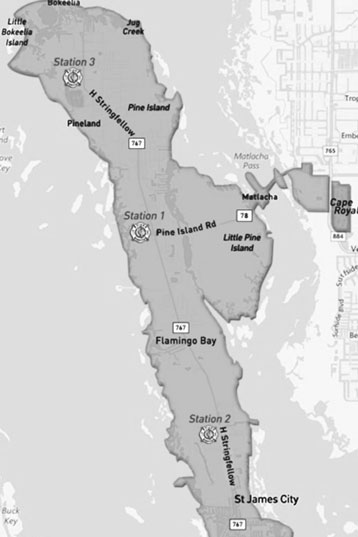 A: As currently proposed, it would be contiguous with the boundaries of the Matlacha Pine Island Fire Control District (see map to the right).